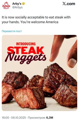 Американцы придумали наггетсы… из стейка, то есть шашлык. Сеть быстрого питания Arby’s представила «уникальное» блюдо — они порезали стейк на маленькие кусочки и назвали их стейк-наггетсы. О дивный мир зумеров